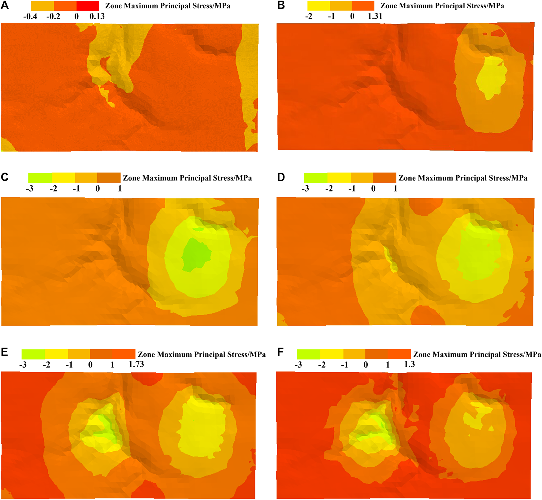 Stress field evolution under different mining progress, (A) coal mining face I advance 100 m, (B) coal mining face I advance 250 m, (C) coal mining face I advance 350 m, (D) coal mining face II advance 100 m, (E) coal mining face II advance 250 m, (F) coal mining face II advance 350 m.