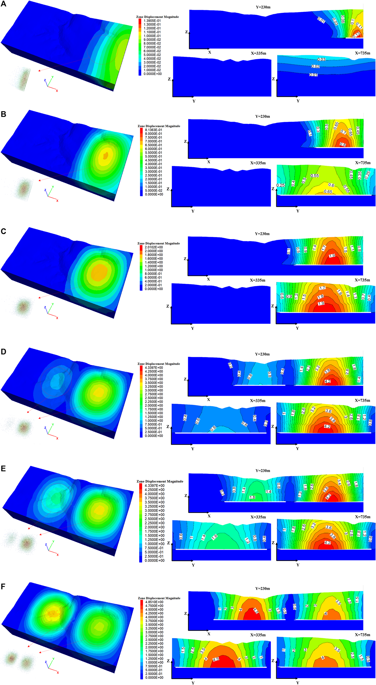 Contour maps of model surface subsidence, (A) coal mining face I advance 200 m, (B) coal mining face I advance 250 m, (C) coal mining face I advance 350 m, (D) coal mining face II advance 200 m, (E) coal mining face II advance 250 m, (F) coal mining face II advance 350 m.