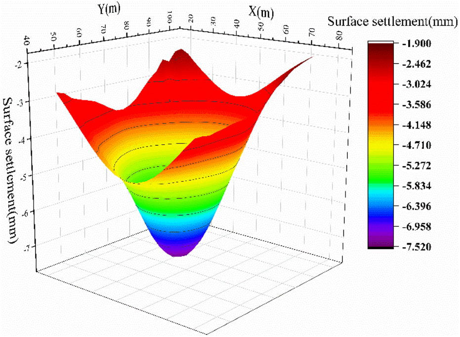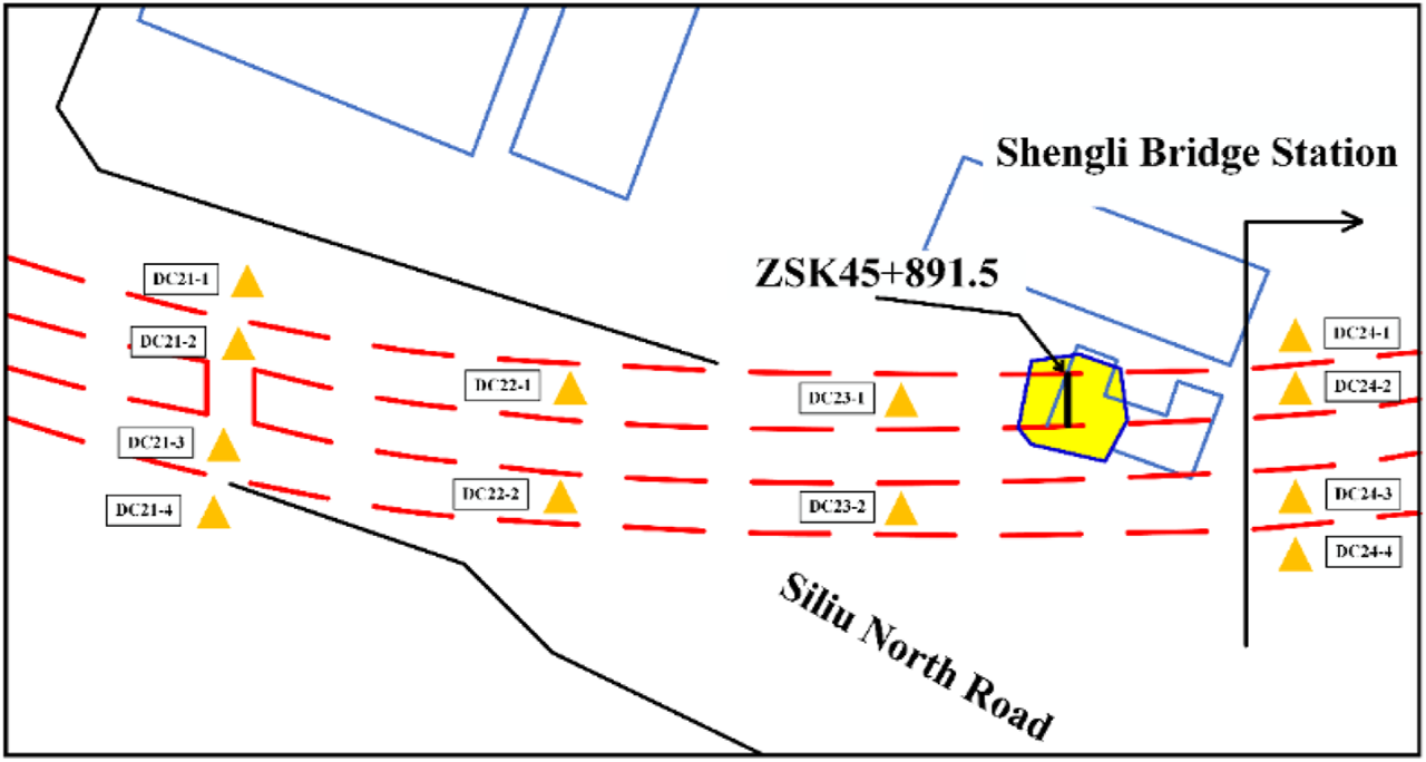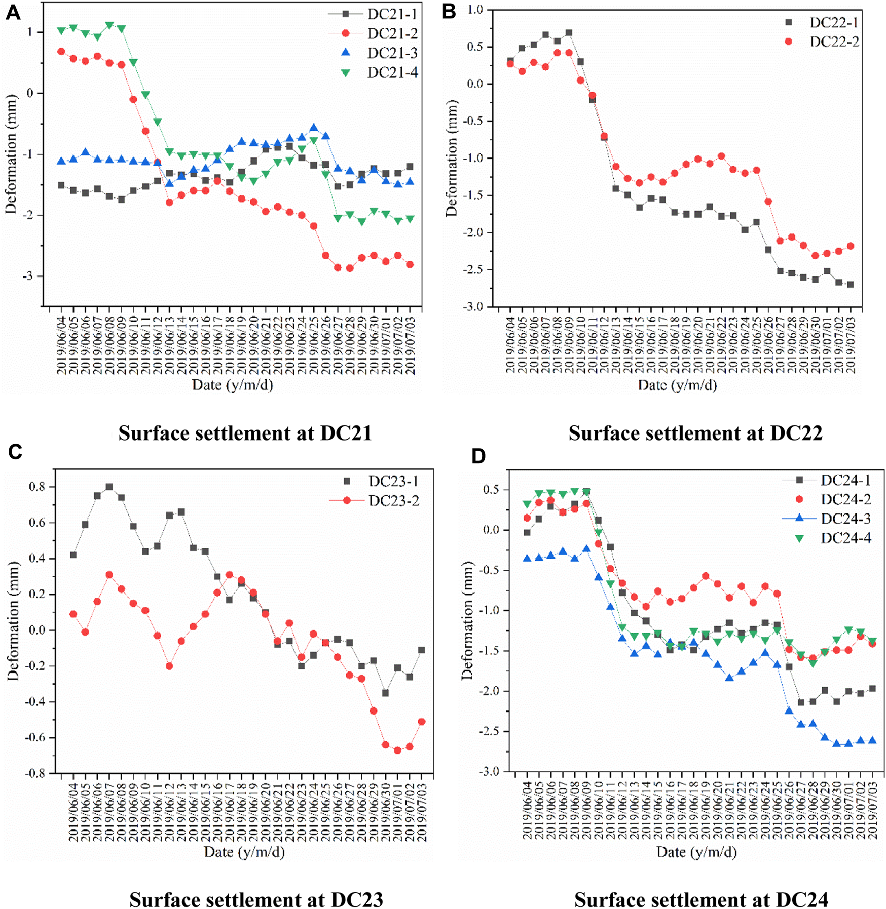 In order to understand the impact of the construction on the surrounding environment and ensure the construction safety, many monitoring points were placed on the surface to record the ground settlement, as shown in Figure 5. The interval between two adjacent monitoring points for ground surface settlement, e.g., DC22 and DC23, is about 20Â m. Figure 6 shows the variations of ground settlement from 4 June to 3 July 2019. It can be observed that the settlement increased rapidly at DC21, DC22 and DC24 from 9 June to 13 June During this period, the average settlement rate at DC21-2 was the largest, i.e., 0.57Â mm/d. After 13 June, the deformation at the three points fluctuated slightly. But on 25 June, the sudden changes of settlement occurred again at DC21, DC22 and DC24. At this time, the settlement rate at DC21-4 was the largest, reaching 0.72Â mm/d. After 27 June, the monitor values of three points fluctuated slightly. In particular, the surface deformation fluctuation of DC23 was relatively obvious, changing from heave to subsidence on 7 June, and from subsidence to heave on 12 June From 17 June to 30 June, the surface deformation at DC23 exhibited continuous subsidence at other times except for slight fluctuation around June 23. Furthermore, from June 28 to 30, the settlement of this point showed a slight acceleration, with an average settlement rate of 0.18Â mm/d, which was higher than the previous 5Â days of 0.06Â mm/d. Besides, the largest monitor value is 2.81Â mm at DC21-2.