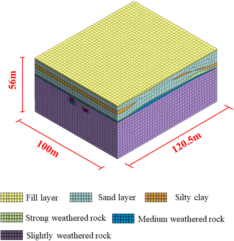 In this section, the numerical model was performed to study the surface deformation, and to analyze the evolution of collapse. Based on the practical geological of the tunnel from ZSK 45+816.5 to ZSK 45+937.00, the 3D finite element numerical model was established by Midas GTX NX, as shown in Figure 7. The model size was 100 m×120.5 m×56 m, and the buried depth of tunnel was 18.5 m. In the model, the mechanical properties of strata are shown in Table 2. Meanwhile, considering the deterioration of surrounding rock caused by seepage, blasting and other factors, the values of c and were taken as 60% of the values in Table 2 (Qiu et al., 2021). According to the actual excavation process, the left tunnel face was ahead of the right tunnel face with an interval of 15 m. The tunnel was excavated by the benching method, with a single bench length of 5 m. After the excavation of each bench, C25 concrete was conducted as the initial support. In terms of on-site support, only 3 m was supported after the last bench excavation was completed, and 2 m suspension space was set between the primary support and the tunnel face. The water level of the model was set at the bottom of the plain fill, i.e., at the interface with the sand layer, which was about −2 m.