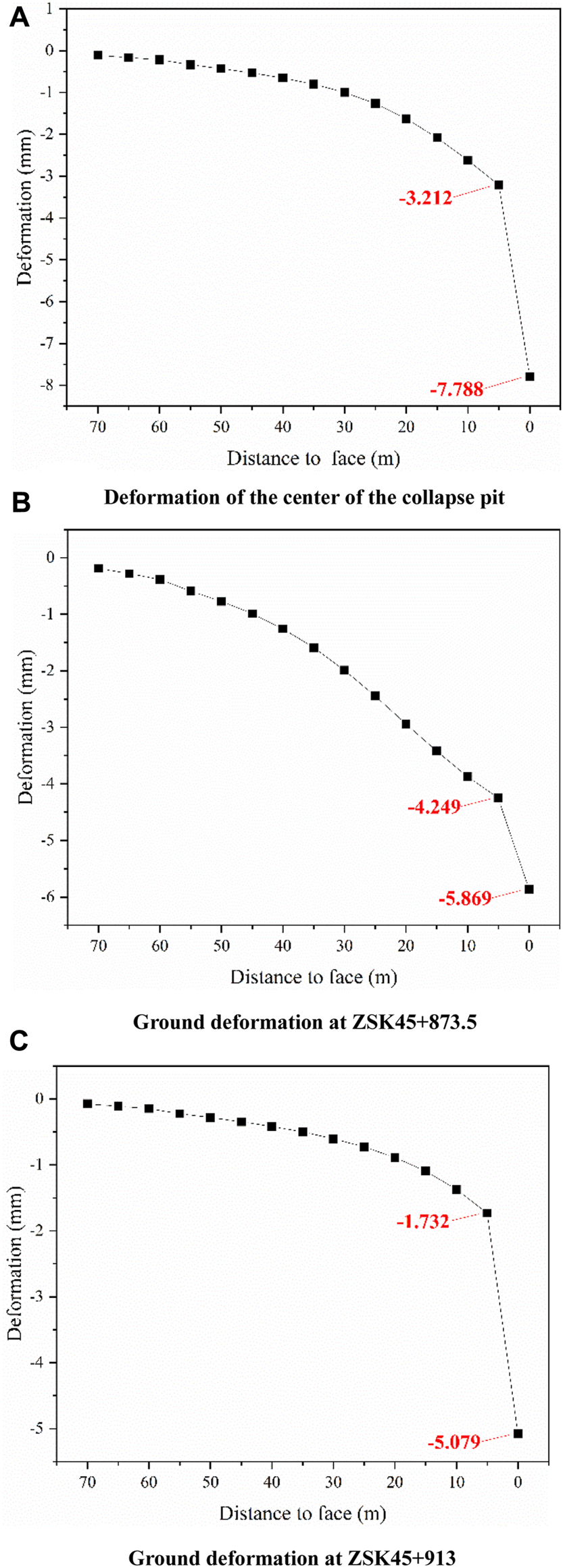 Deformation at different locations. (A) Deformation of the center of the collapse pit. (B) Ground deformation at ZSK45+873.5. (C) Ground deformation at ZSK45+913.