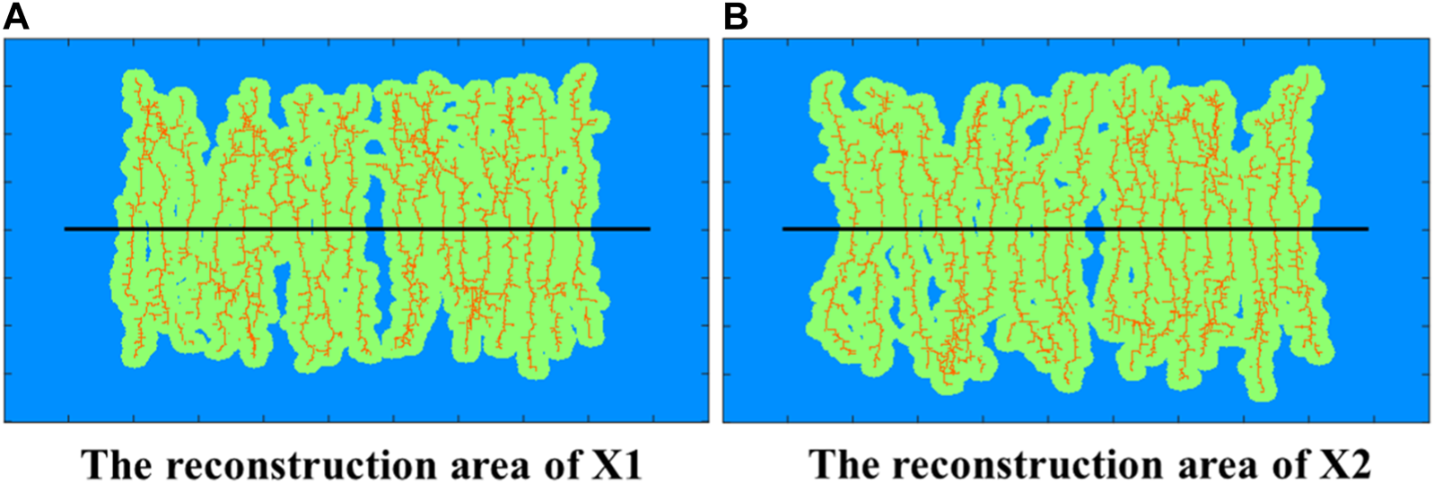 Figure 5 shows the fracture morphology of the two wells after fracturing. The simulation results show that the fracture length of the X1 well is approximately 290 m, and the reconstruction area is 47962 m2. The fracture length of the X2 well is approximately 300 m, and the reconstruction area is 52686 m2. The repeated reconstruction area of the two wells is 8469 m2, and the fracture channeling coefficient of the child well is 16.1%. Figure 6 shows that the fracture channeling area of the two wells occupies nearly half of the seepage intersection area between the two wells, and there is a great risk of fracture channeling.