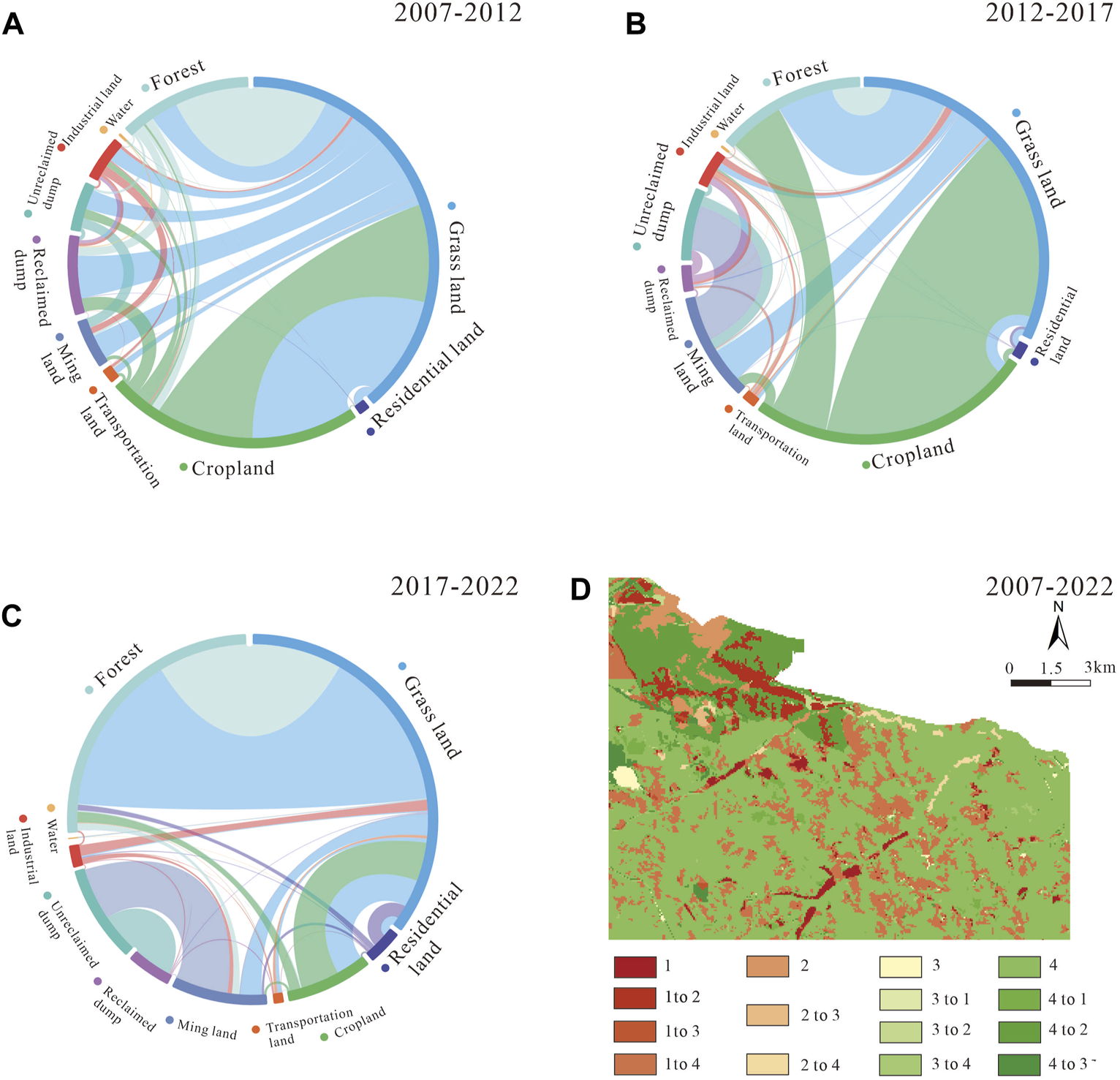 To more clearly describe the fluidity and variety of LULC changes, we used the chord diagram to quantify the transformational relationships between LULC types from different periods in Figure 5. The transfer of LULC types from 2007 to 2022 are listed in Table 4. The results show a clear shift in LULC types, with grassland the dominant contributor to the change in all LULC types, with 18.65 km2 transferred to other land types and accounting for 27.44% of those diversions being the most pronounced from 2007 to 2012 (Figure 5A), and 17.42 km2 transferred in. Cropland was the largest LULC type to be transferred out, with the area amounting to 20.27 km2, accounting for 91.78%, most obvious from 2012 to 2017 (Figure 5B), while only 1.61 km2 was transferred in. The area of water transferred out (0.11 km2) was larger than that transferred in (0.09 km2). The area of forest and reclaimed dump were the major LULC types being transferred in (Figures 5B, C), with areas of 11.02 km2 and 5.84 km2, respectively, which were mainly from grassland and cropland, and 5.62 km2 and 0.22 km2 were transferred out, respectively. Similarly, the area of industrial land, residential land, unreclaimed dump, and mining land transferred in (1.82, 1.30, 4.97, and 2.99 km2, respectively) was larger than that transferred out (1.67, 0.92, 0.34, and 0.51 km2).
