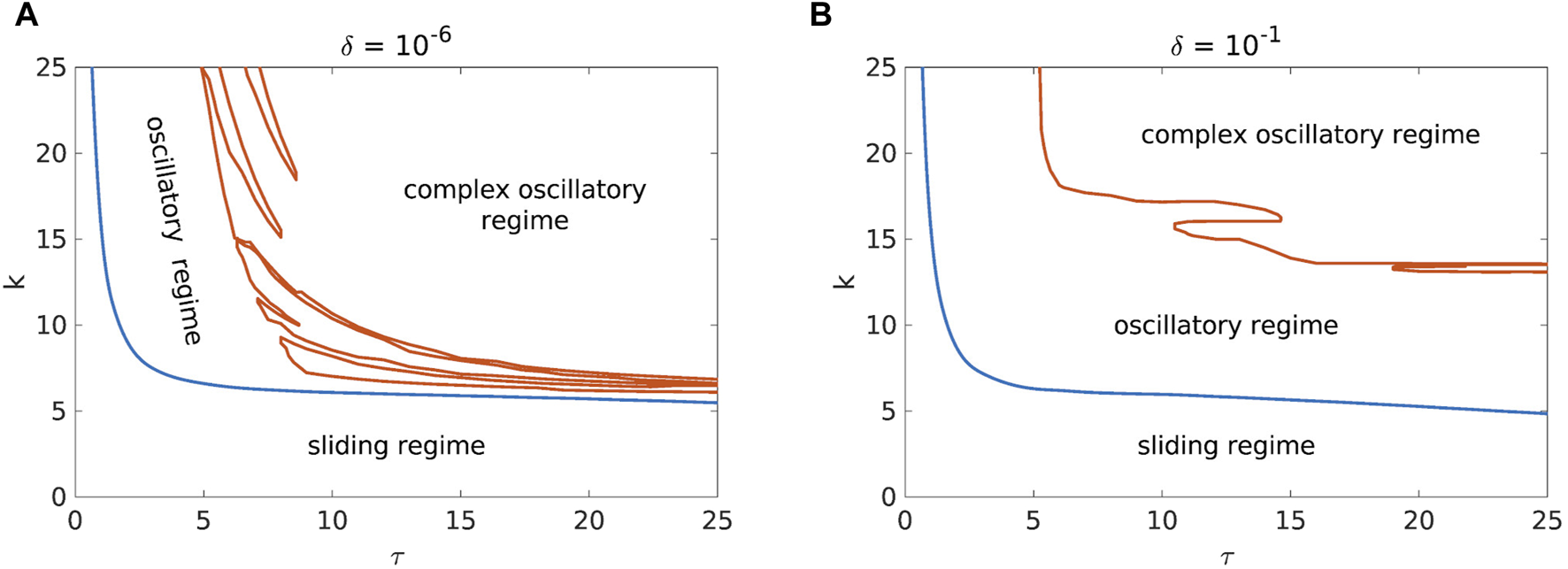System (6a)–(6e) was solved numerically in MATLAB using the forward Euler method with time step dt = 0.001 for a dense selection of system parameters and a wide range of initial conditions δ. The late-time series of solutions were then automatically classified as describing (asymptotically) sliding, oscillatory or complex oscillatory regime. The classification was done by looking at the time series in a window t ∈ [99000, 100000]. Examples of solutions in these regimes are shown in Figure 2. The solution is classified as unstable if the oscillation amplitude increases exponentially and reaches numerical infinity within a very short time, which terminates the numerical simulation.