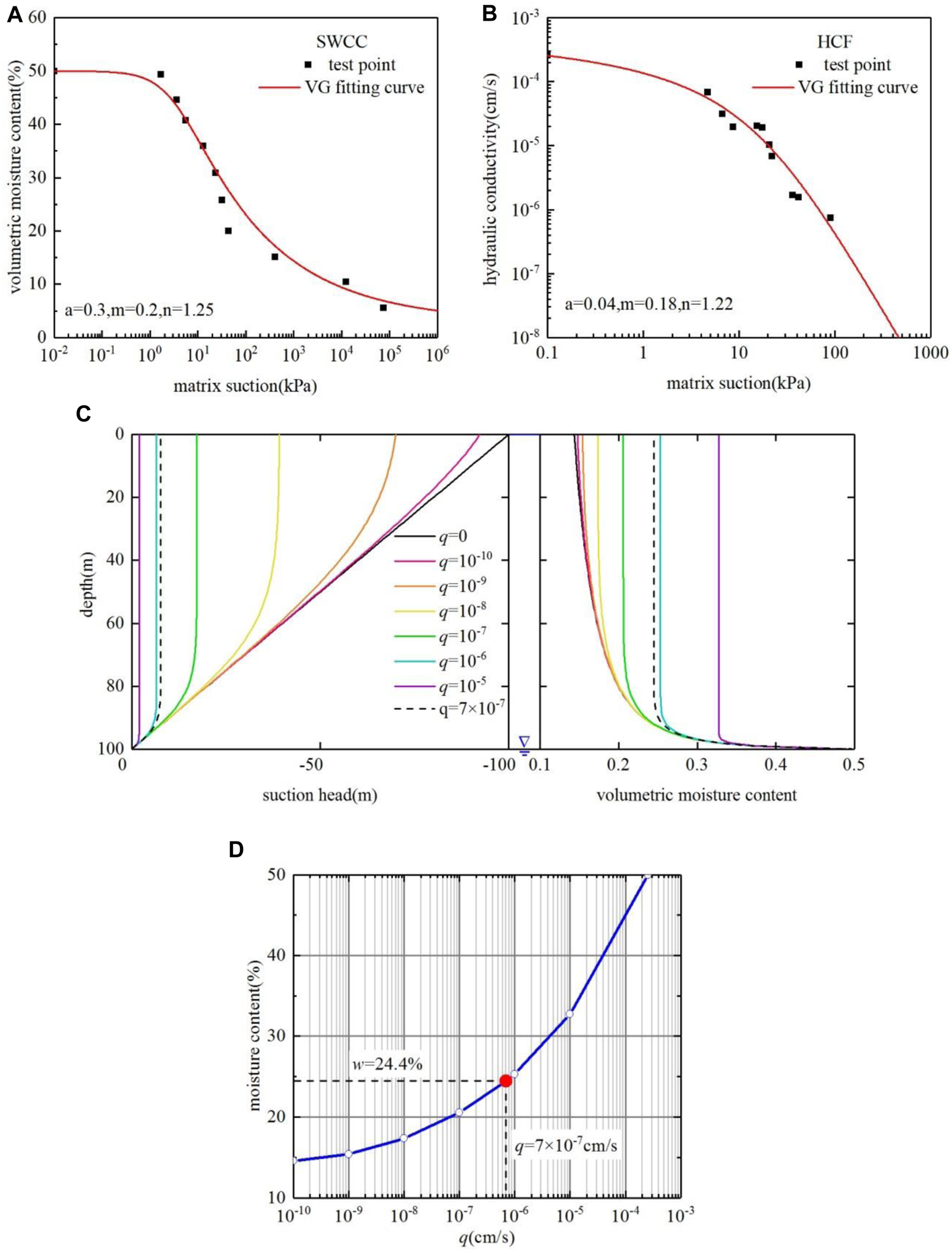 Theoretical calculations. (A) SWCC; (B) HFC; (C) The calculation results of the suction head and moisture content with depth; (D) The relationship between q and moisture content.