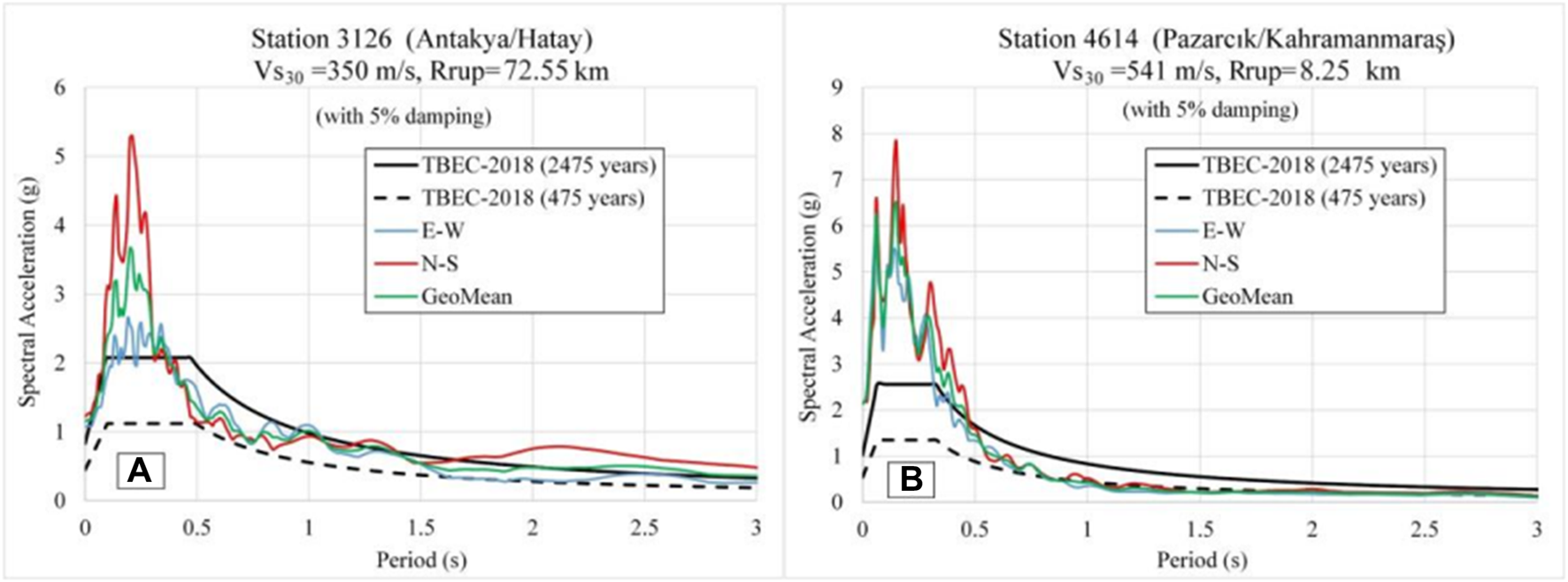 Response spectra compared with TBEC-2018 at stations (A) 3126 and (B) 4614, in relation to the Pazarcık earthquake (Mw = 7.7). (from Alpyüryür and Ulutas, 2024).