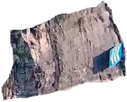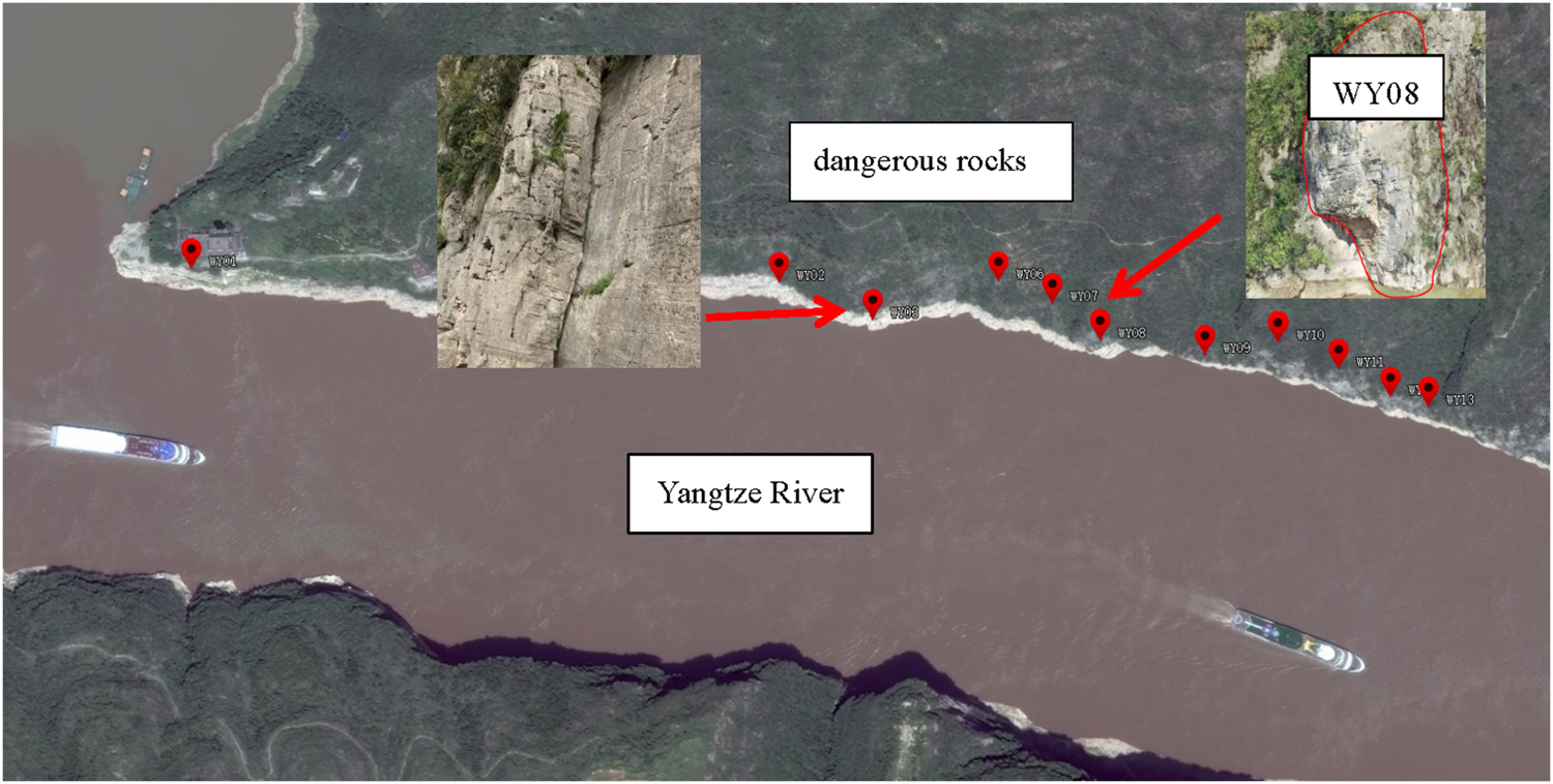 The Qutangxia ancient boardwalk dangerous rock zone is widely distributed with a large number of small-scale loose dangerous rock, surface fractured zones, and dangerous rock masses as shown in Figure 9. There is a possibility of small-scale weathering and collapse, loose block collapse, and dangerous rock collapse. This time, non-contact surface deformation measurements were conducted on dangerous rock masses located in Groups 14 and 15 of Qutangxia Community, Kuimen Street, which have a certain scale and may form surging waves. The monitoring object is WY08, with the top elevation is 219 m, the bottom elevation is 168 m, and the overall slope is about 83°. The dangerous rock is 15 m wide, 62 m high, and 13 m thick, with a total area of about 930 m2 and a total volume of about 12090 m3. The terrain in the area is steep cliffs, with a steep slope on the banks of the Yangtze River. The cracks in the dangerous rock mass are well-developed and cut into blocks by cracks. The cracks are interconnected, and rainfall infiltration has a significant impact on the stability of the dangerous rock mass. Under rainfall, earthquakes, or artificial disturbances, it is prone to collapse and falling blocks, with potential threats to the Yangtze River waterway and some scenic boardwalks below, which may cause economic losses of about 6 million yuan (CNY).