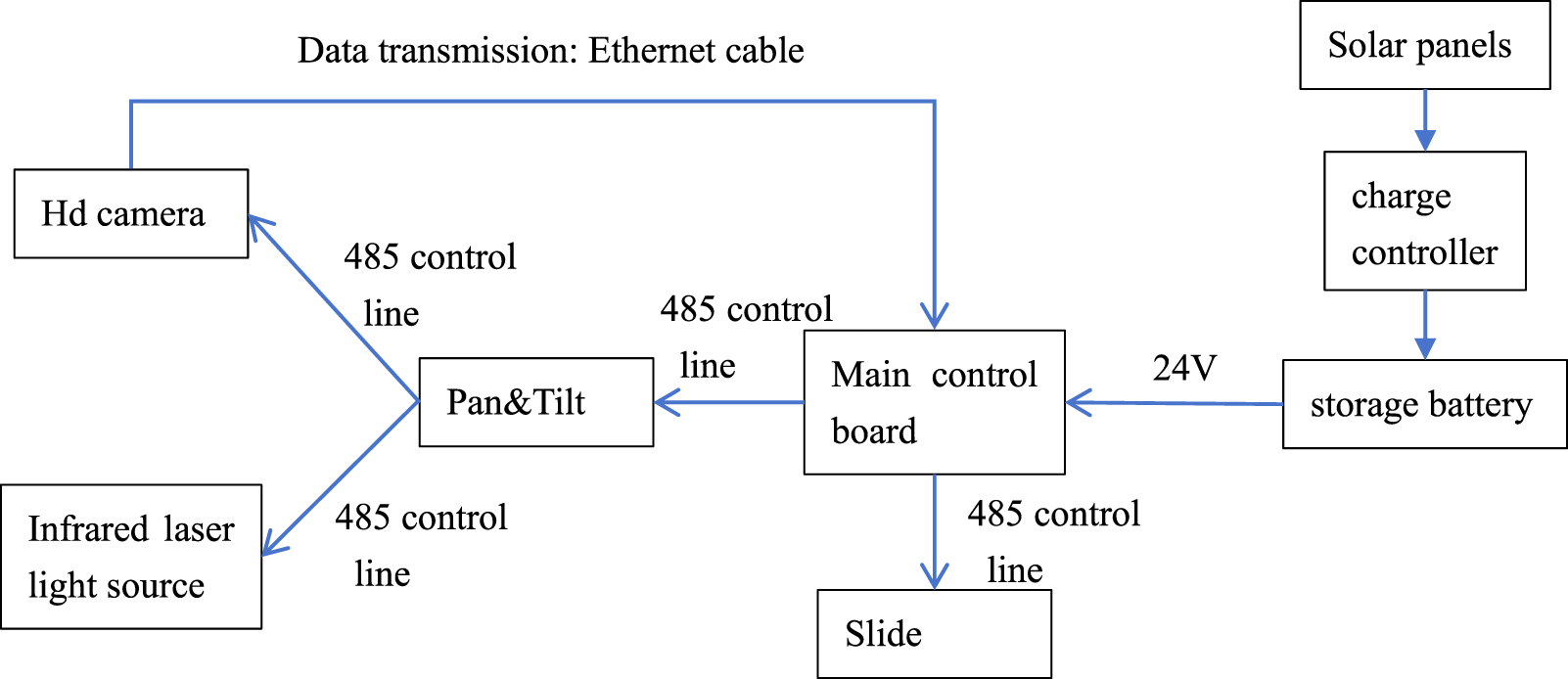 The front-end acquisition system includes a high-definition camera, infrared laser compensator, pan tilt, slide rail, and main control circuit board. The high-definition camera and infrared laser fill module are mounted on the gimbal and also receive logical control from the main control board. The main control circuit board mainly realizes functions such as image acquisition, image storage and transmission, acquisition logic control, power supply and low-power management. Due to the difficulty in providing electricity in the wild, this system uses a combination of solar panels and batteries. The principle of the front-end collection system is shown in Figure 2.