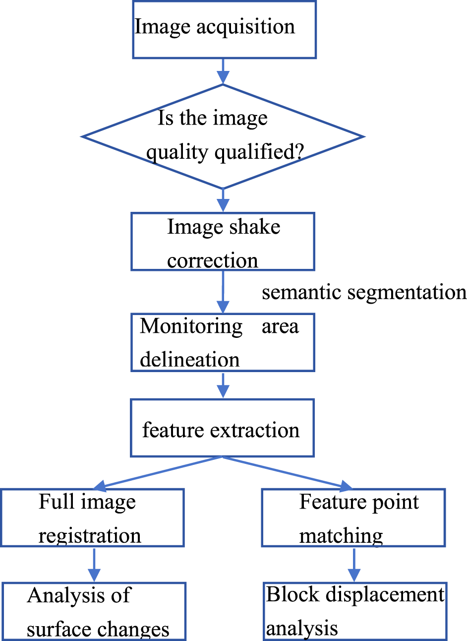 After the image is transmitted to the server, the solution algorithm begins to perform quantitative displacement analysis on the image. Firstly, the algorithm will evaluate the image quality, including its clarity, jitter level, etc., Images that do not meet the calculation requirements will be discarded. The image that meets the calculation requirements will first undergo semantic segmentation, cutting out interference areas such as vegetation and sky in the image, and extracting features from the reserved areas (Hsieh et al., 2011). Then, the algorithm analyzes the surface terrain, identifies differences in the surface, and performs feature matching on manually selected monitoring areas to identify displacement in key areas. Figure 5 shows the algorithm flowchart.