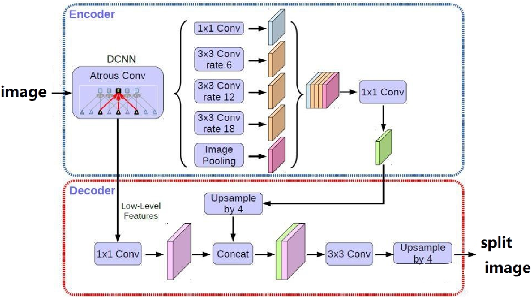 In order to eliminate the interference of vegetation and other factors on the measurement of the target area, a semantic segmentation method based on deep learning is adopted to automatically extract effective monitoring areas. Semantic segmentation is a classification at the pixel level, where pixels belonging to the same class are grouped together. Semantic segmentation is a method of understanding images from the pixel level. DeepLab v3 is currently a widely used semantic segmentation method, which is a semantic segmentation model based on deep convolutional neural networks, proposed by the Google Brain team in 2017 (Chen et al., 2017) as shown in Figure 6. The main feature of DeepLab v3 is its ability to effectively utilize multi-scale contextual information and low-level features for semantic segmentation, achieving excellent performance on multiple datasets.