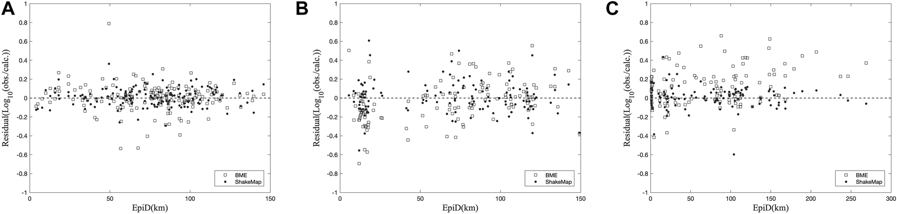 Residual analysis. The abscissa is the epicenter distance, and the ordinate is the logarithmic ratio of the measured data to the predicted data. Comparison of the results of the ShakeMap and BME method for the (A) Japan earthquake, (B) US earthquake and (C) Turkey earthquake.