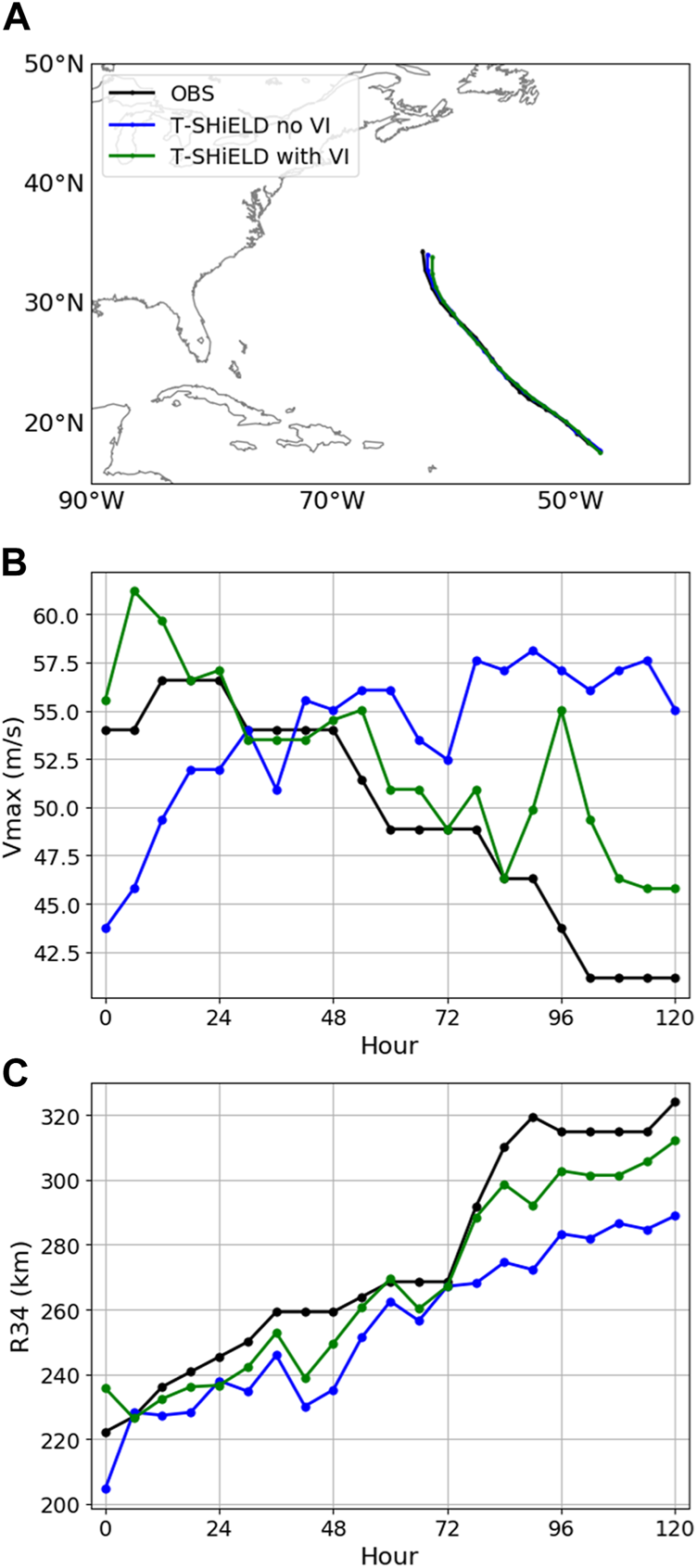 Figure 5 shows the prediction for Hurricane Larry (2021) initialized on 2021-09-05 00:00 UTC. Using VI only has minor impact on the predicted track, which is somewhat expected, given that we only made modifications on the initial TC vortex but not the environment or the steering flow. There are significant impacts on the predicted storm intensity and R34. Most notably, the gap between the model and observed intensity at initiation (∼10 m/s) is effectively closed (Figure 5B).
