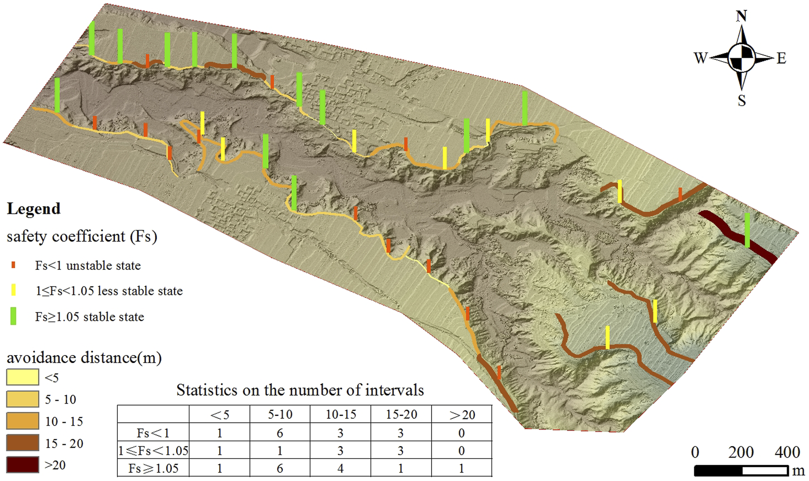 Following the method above to build slope models, and using the simplified Bishop method, we sequentially calculate the safety coefficient and avoidance distance of 32 profiles in the study area. We use four indicators, i.e., slope height, slope angle, safety coefficient and avoidance distance, to characterize the feature and calculation results of each profile, and then carry out further statistical analysis. As is shown in Table 3 and Figure 7.