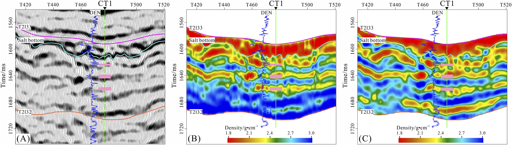 Figure 9. Seismic profile (A); inverted density profile based on the facies-constrained reflectivity method (B) and on traditional Zoeppritz equation (C). The purple squares in the figure represent the reservoirs.