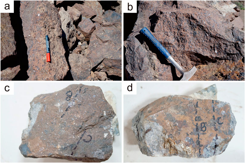 Figure 2. Photographs of a representative field sample (a,b) and hand specimen (c,d) of siderite carbonatites from the Bayan Obo deposit, exhibiting a porphyritic texture. The phenocrysts are predominantly composed of siderite, while the matrix consists of dolomite, magnetite, and monazite.