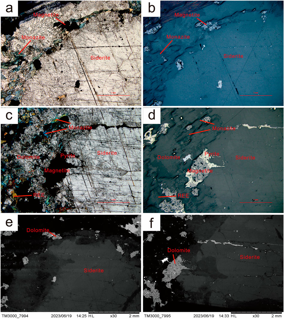 Figure 3. Photomicrographs in cross-polarized transmitted light (a,c), reflected light (b,d), and scanning electron microscope backscattered-electron images (e,f) of siderite carbonatites from the Bayan Obo deposit, highlighting key geological features, ore mineral assemblages, and textures within the mineralization stages. (Abbreviations: Mag, magnetite; Mnz, monazite; Sid, siderite; Dol, dolomite; Py, pyrite; Bst, bastnäsite; Whitney and Evans, 2010).