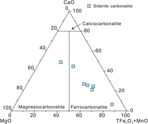 Figure 4. Carbonatite classification diagram of CaO-MgO-Fe2O3T + MnO (Woolley and Kempe, 1989; Le Maitre, 2002) for siderite carbonatites from the Bayan Obo deposit.