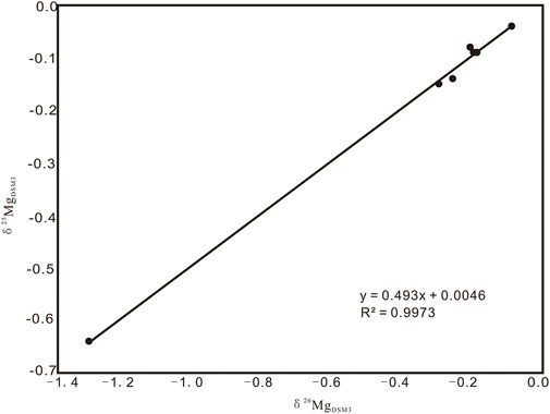 Figure 5. Linear diagram of δ25MgDSM3 versus δ26MgDSM3 for siderite carbonatites from the Bayan Obo deposit.
