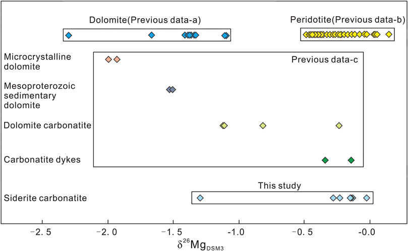 Previous study indicates that the Mg isotope composition of sedimentary dolomites varies significantly (δ26Mg is −2.29–−1.09‰; Galy et al., 2002; Chang et al., 2004; Tipper et al., 2006b; Brenot et al., 2008). This might be related to factors like varying ages or geological backgrounds of dolomite. To compare with the dolomite carbonatites from the Bayan Obo deposit, it is necessary to obtain the Mg isotope composition of the sedimentary dolomites in the H8 rock section of the Bayan Obo Group. This can be obtained from the Kuangou north sedimentary dolomite, whose δ26Mg is −1.67 –−1.54‰. This should represent the Mg isotope composition characteristics of the dolomites in the H8 rock section of the Bayan Obo Group. Moreover, the δ26Mg of the Middle Proterozoic dolomite in Pingquan area is −1.81–−1.53‰, consistent with the Mg isotope of the sedimentary dolomites in Kuangou north. This suggests that the sedimentary dolomites in Bayan Obo Pingquan area during the Middle Proterozoic period has a consistent Mg isotope composition. The δ26Mg of sedimentary dolomites from the Middle Proterozoic in the Bayan Obo area should be −1.81–−1.53‰.