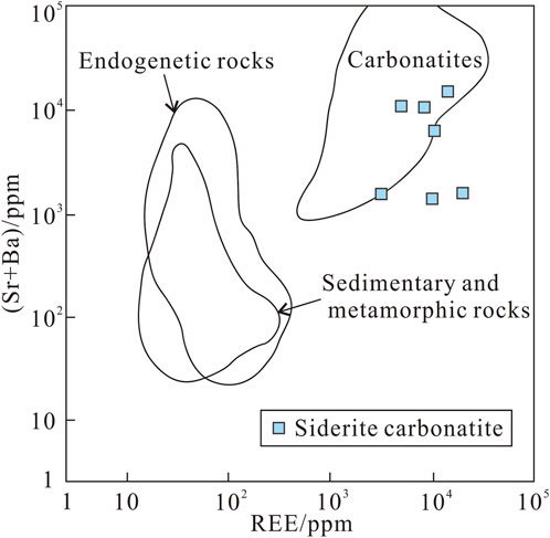 Fluid metasomatism in subducting marine sediments is thought to be the cause of rare earth enrichment in mantle source area associated with carbonate rocks (Hou et al., 2015). The Bayan Obo siderite carbonatites exhibit high Sr (796.3–6,343.1 ppm), Ba (84.8–11,593.0 ppm), and LREE (2,631.0–20,283.1 ppm) (Figure 8), as well as a high Ba/Th ratio (0.64–68.66) characteristics, which supports the fluid metasomatism model in sediments. Diving marine sediments are rich in REE and CO2 fluids, which typically have high concentrations of large ion lithophile elements (LILE) and relatively low quantities of high field strength elements (HFSE), resulting in high LILE/HFSE ratios (Turner et al., 1997; Elburg et al., 2022). This type of CO2 rich fluid metasomatism produces carbonate rocks enriched in LILE and REE. During partial melting, HFSE, HREE, and others are retained in the titanium iron oxide, whereas LILE and LREE preferentially penetrate the melt (Foley et al., 2000; Gaetani et al., 2008; Hammouda et al., 2009). This explains the reason for the enrichment of rare earth elements in the mantle source region.