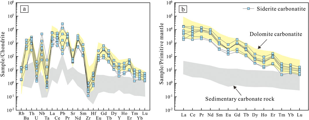 Figure 8. (a) Chondrite-normalized REE pattern diagram and (b) primitive mantle-normalized trace element spider diagram for the siderite carbonatites from the Bayan Obo deposit (Data sources: Ling et al., 2011; Sun et al., 2012).