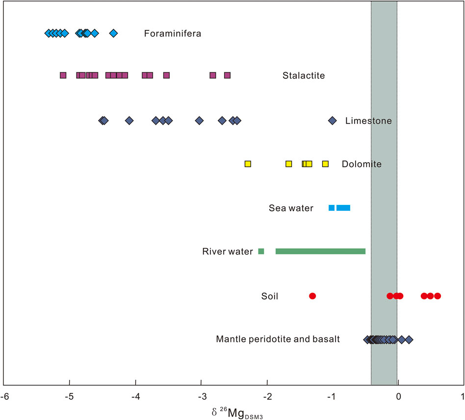 The upper mantle exhibits a relatively homogeneous Mg isotopic composition. Chondrites, mantle peridotites, and basalts yield δ26Mg values of −0.49 to +0.06‰, averaging around −0.24‰ (Ke et al., 2011), indicating a narrow mantle range. In contrast, the continental crust, especially the upper crust, shows significant isotopic heterogeneity. Soils are commonly enriched in heavy Mg isotopes relative to basalt, whereas sedimentary carbonates are generally isotopically lighter. Carbonates display large variations (δ26Mg = −4.84 to −1.00‰; Galy et al., 2002; Tipper et al., 2006a; Tipper et al., 2006b; Pogge von Strandmann et al., 2008). Within this group, dolomite tends to have relatively heavier values (−2.29 to −1.09‰), whereas limestones are lighter (−4.47 to −2.43‰). Such differences reflect equilibrium fractionation among dolomite, calcite, and water (Galy et al., 2002). Stalactites and foraminifera yield even lighter δ26Mg values, indicating significant biological or low-temperature fractionation (Chang et al., 2004; Pogge von Strandmann et al., 2008).