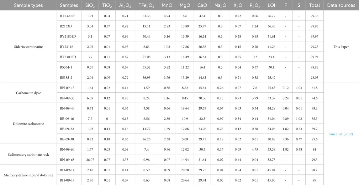 Whole-rock major and trace element analyses of Bayan Obo siderite carbonatites were carried out at Yanduzhongshi Geological Analysis Laboratories Ltd., Beijing, China. Major elements were determined by X-ray fluorescence spectrometry (Zetium, PANalytical Malvern, United Kingdom) with analytical uncertainties better than 1%. Trace elements were measured by inductively coupled plasma–mass spectrometry (ICP-MS), with accuracies better than 5% relative to the GSR-2 standard. For volatile and ultra-trace elements, analytical errors did not exceed 10%.
