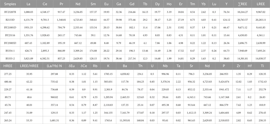 The trace and rare earth element compositions of the Bayan Obo siderite carbonatites differ markedly from those of sedimentary carbonate rocks and are broadly comparable with dolomite carbonatites (Table 2). The total REE (ΣREE) ranges from 2,696.75 to 20,763.57 ppm. The REE patterns are right-skewed, indicating pronounced light rare earth elements (LREE) enrichment (La/YbN = 129.15–1,681.51) and heavy rare earth elements (HREE) depletion. Ce shows slight positive anomalies, while Eu exhibits moderate negative anomalies, suggesting variable oxidation states during mineral formation (Figure 5b). Trace elements such as Ba, Th, and Nb show significant positive anomalies, likely reflecting contributions from accessory minerals (e.g., monazite, bastnäsite), whereas Rb, U, Ta, and Zr display strong negative anomalies (Figure 5a). Compared with sedimentary carbonate rocks, the siderite carbonatites are notably enriched in Mg, Fe, and LREE, consistent with their magmatic-hydrothermal origin. The geochemical characteristics provide insights into the fractionation processes and metallogenic environment of the deposit.