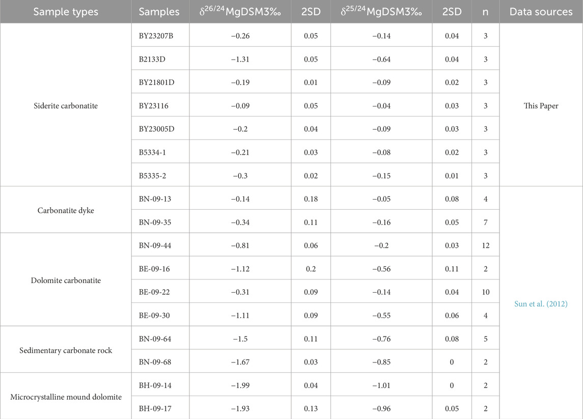 Table 3. Mg isotopic compositions of siderite carbonatite, carbonatite dyke, dolomite carbonatite, sedimentary carbonate rock and microcrystalline mound dolomite from the Bayan Obo deposit.