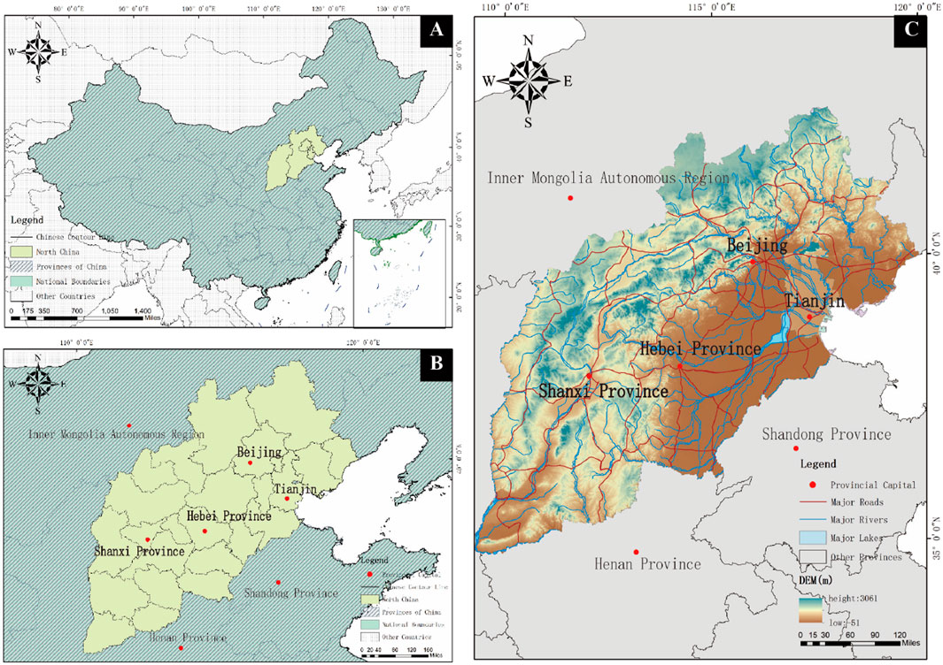 Geographically, China is naturally divided into several regions, including North China, which mostly consists of the provinces of Beijing, Tianjin, Hebei, and Shanxi. The region’s geographic coordinates are 32°28′N to 42°88′N and 110°05′E to 120°35′E (Figure 1). Plateaus, mountains, hills, plains, and basins are among the landform types found in North China’s undulating terrain. The two most notable topographic regions in the area are the North China plain and the Loess Plateau in northwest China. Whereas China’s North China Plain is an open-level plain that serves as a major grain-producing region and has one of the country’s many significant flatlands, the Loess Plateau, which is the world’s largest area of soil accumulation. Furthermore, North China’s geomorphology has been significantly impacted by human movements. For example, long-term agricultural practices have resulted in issues like soil corrosion, salinization, and sanding of the land; additionally, the development of water conservation projects has impacted river flow patterns along with geomorphic features (Shan et al., 2022).