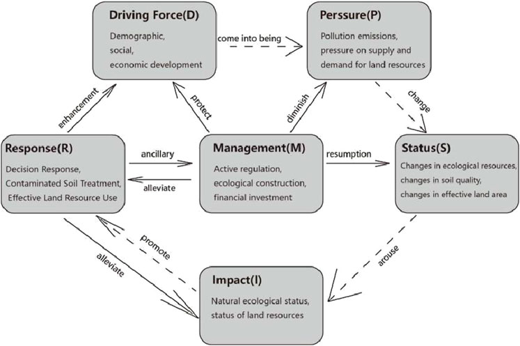 1. According to the DPSIRM model: the exponent method used in this paper to evaluate the ESLR in North China is based on the DPSIRM model (Figure 2). The six components of the DPSIRM model are as follows: drivers: fundamental socioeconomic elements, such as population increase and patterns of economic development, which contribute to environmental issues; pressures: adverse effects brought on by drivers, such as resource use and pollution emissions; state: the current state of the environment, such as the quality of the soil or the water; impact: how a change in state affects ecosystems and human health; response: the reaction to an environmental issue, encompassing laws, policies, and other measures; and measures: practical actions and technical means to mitigate environmental problems and impacts (He et al., 2022; Liu et al., 2023).