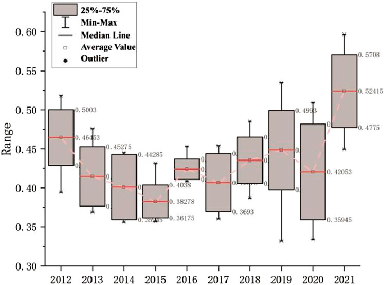 Figure 7. Trends in land resource box plots by area in North China, 2012–2021 (author’s own drawing).