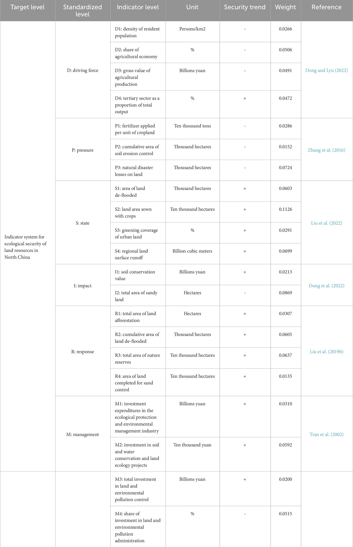 2. Indicator system construction: integration of study area realities follows the scientific and rational principle of ESLR evaluation. Building upon the DPSIRM framework, in this study, we conducted a comprehensive assessment of land resource impacts through multidimensional evaluation across five critical societal dimensions: socioeconomic development, environmental quality, resource allocation, ecological integrity, and policy implementation. The analytical framework systematically integrates six core components—driving forces, environmental pressures, system states, ecological impacts, governance responses, and management strategies—which collectively guided the selection of 21 critical evaluation indicators (Du et al., 2023). This methodological approach enabled the construction of a three-tiered ecological security assessment system for land resources, organized hierarchically as shown in Table 1. The data in Table 1 were imported into SPSS software, and the weights were calculated.