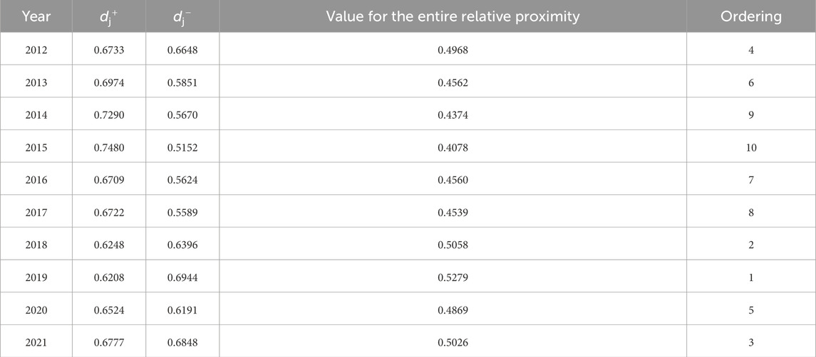 In terms of entropy magnitude, the TOPSIS model is a widely used integrated appraisal technique that smoothly minimizes the personal variables present with the traditional TOPSIS approach, makes the most of raw data samples, and accurately and realistically depicts how the influencing factors have changed over time (Jayasooriya et al., 2018). The entropy-weighted weight TOPSIS model is currently widely used in numerous fields, including to measure the degree of development of economic quality, assess the ecological and environmental carrying capacity of land assets, and evaluate land-use performance (Şengül et al., 2015).