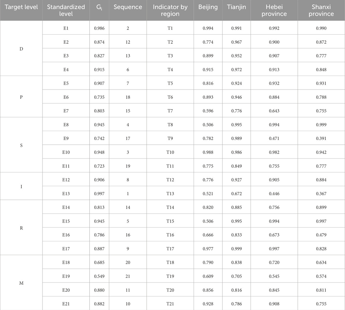The gray correlation between the 21 indicators in the indicator layer has a maximum amplitude of 0.448 and a range of 0.549–0.997. The overall area of sandy land in E13, which has the highest gray correlation, is only 1.29 times larger than the investment made in soil and water preservation and land ecological items in E19, which has the lowest gray correlation. This indicates that the correlation difference between the indicators is not very large. It demonstrates that the geometric distribution pattern of the indicators influencing the ESLR in North China exhibits a certain association. The minimal polarity difference between particular extremes further suggests that the indicators chosen for this investigation were somewhat logical (Table 5).