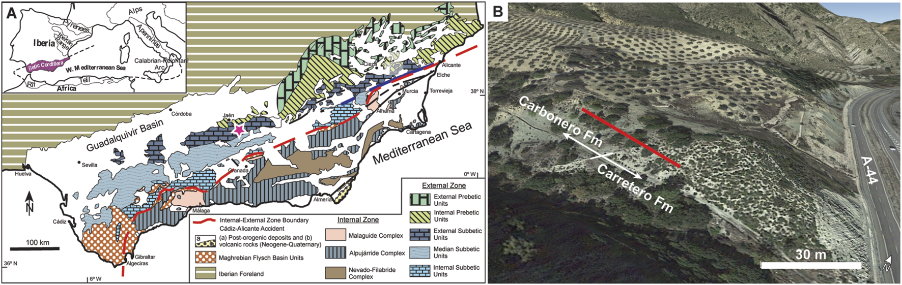 (A) Geologic map of the Betic Cordillera modified after Guerrera et al. (2014). The pink star marks the location of the studied site. (B) Aerial view of the La Frontera section, the red line indicates the ∼28 m interval that was sampled.