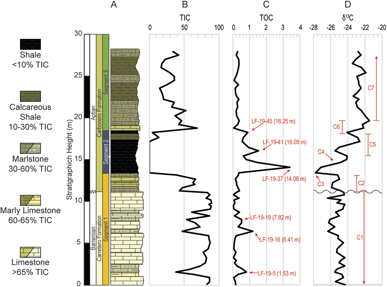 (A) Simplified lithologic column of the ∼28 m studied interval of the La Frontera section. Carbon geochemistry plots: (B) total inorganic carbon (TIC) in %CaCO3; (C) total organic carbon (TOC) in %C; (D) carbon isotope curve on the organic carbon (δ13Corg) plotted in per mil (‰) relative to the Vienna Pee Dee Belemnite standard (VPDB).