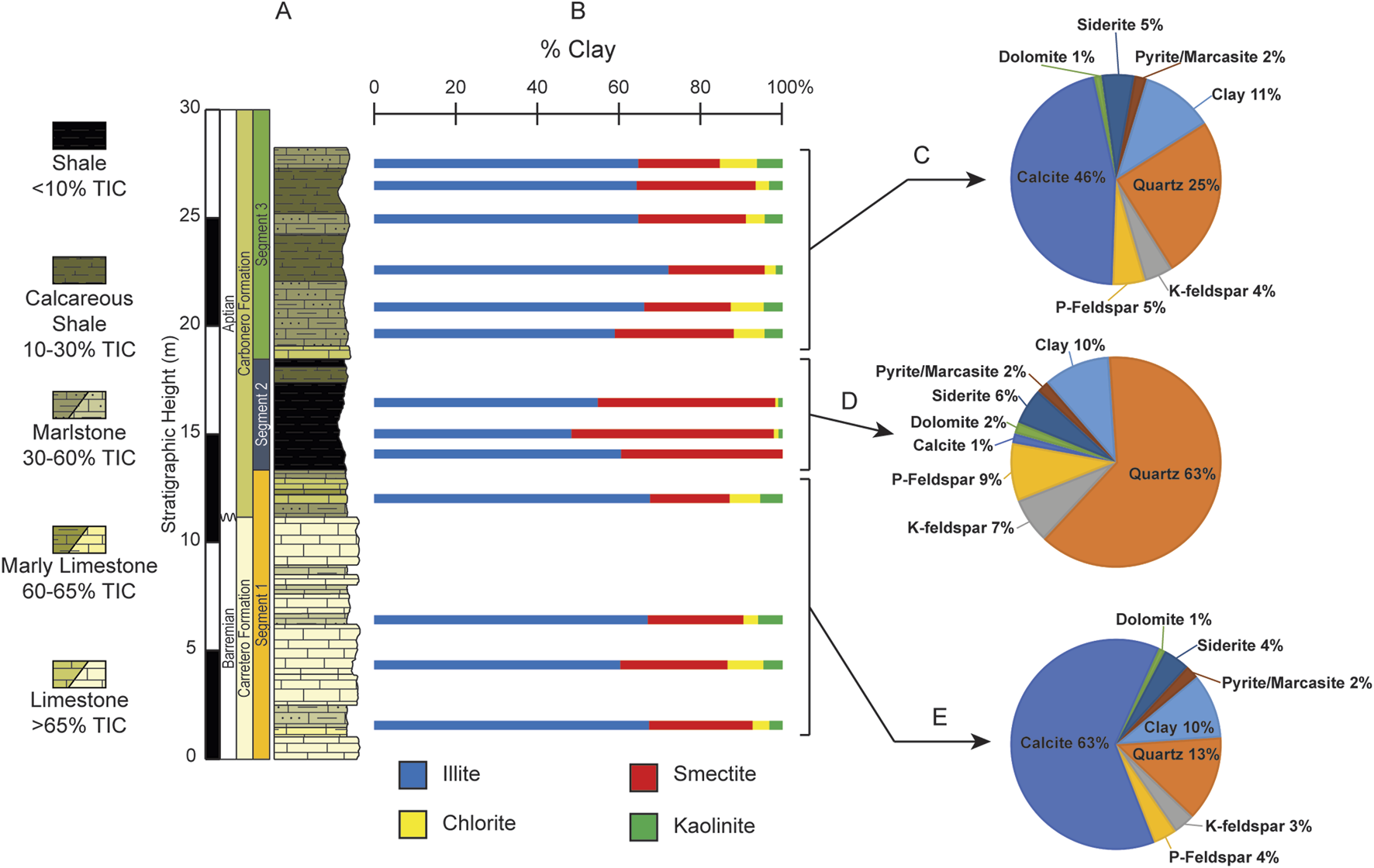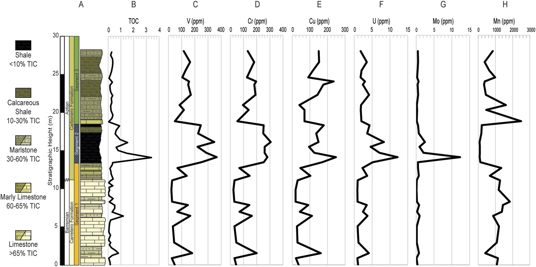 Figure 3 is a compendium of the lithostratigraphy together with the results for TIC, TOC, and δ13Corg, also shown in Table 1. Overall TIC content fluctuates between 0% and 89.6% (Figure 3B), and the temporal distribution of these values permits to distinguish 3 distinct units defined below.