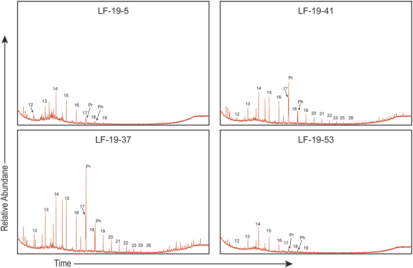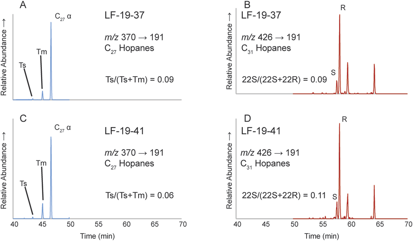 Hopane and steranes were analyzed using a Bruker EvoQ GC triple-quadrupole MS in metastable reaction monitoring mode (MRM-GC/MS/MS). The oven was programed to hold at 65°C for 2 min, then ramped up to 310°C at a rate of 4°C/min and then held isothermally for 10 min. MRM transitions include m/z 370 → 191, 384 → 191, 398 → 191, 412 → 191, 426 → 191, 440 → 191, 454 → 91, 468 → 191, and 482 → 191 for the C27 to C35 hopanes. The C27 to C30 steranes and diasteranes used m/z 372 → 217, 386 → 217, 400 → 217, and 414 → 217 MR M transitions.
