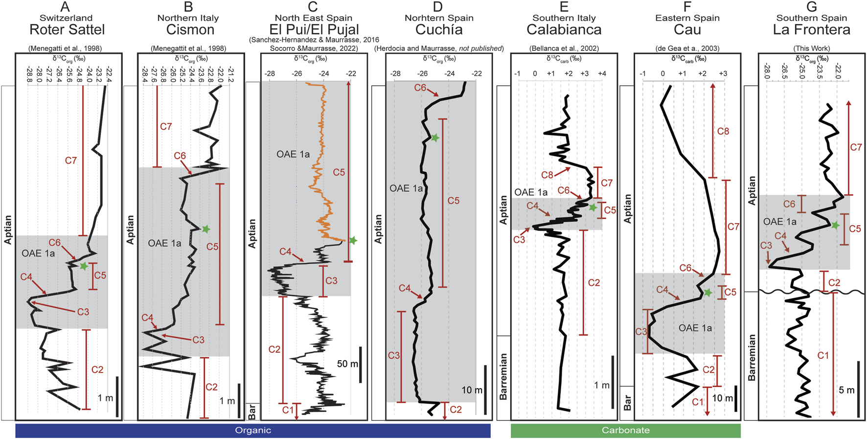 This isotopic signal has been well-documented across multiple Tethyan basins and globally. Most notably these include: the Cismon Core and Gorgo a Cerbara section of the Umbria-Marche Basin (Italy) (Erba et al., 1999; Weissert et al., 1998), the Vocontian Basin (France) (Weissert et al., 1998), the Ionian and Pindos Basins (Greece) (Tsikos et al., 2004), the Exmouth Plateau (Indian Ocean, DSDP Site 766): This deep-sea site offers a crucial record of Southern Hemisphere ocean chemistry and anoxia during OAE1a (Gradstein et al., 1992; Weissert et al., 1998), among others. These global records indicate that OAE1a represents a major perturbation in the Earth’s carbon cycle, that spanned multiple depositional environments and latitudes. OAE1a is conventionally defined by a series of carbon isotope segments (C1–C8), with the anoxic interval corresponding to C3–C6, first identified in the Cismon (Italy) and Rotter Sattel (Switzerland) sections (Menegatti et al., 1998). The widespread documentation of these δ13C trends clearly reflects the geochemical state of the global carbon reservoir, therefore, it is valuable global correlation tool, applicable across marine and terrestrial stratigraphic records (Scholle and Arthur, 1980; Weissert et al., 1998; Kuhnt et al., 1998; Bellanca et al., 2002; Li et al., 2008; de Gea et al., 2003; de Gea et al., 2008; Yilmaz et al., 2004; Millán et al., 2009; Huck et al., 2010; Najarro et al., 2011; Hu et al., 2012; Godet et al., 2014; Aguado et al., 2014a; Aguado et al., 2014b; Sanchez-Hernandez and Maurrasse, 2014; Sanchez-Hernandez and Maurrasse, 2016; Sanchez-Hernandez et al., 2014; Giraud et al., 2018; Socorro and Maurrasse, 2019; Socorro and Maurrasse, 2020; Socorro and Maurrasse, 2022; Zhang et al., 2021; Herdocia and Maurrasse, 2022, and others).