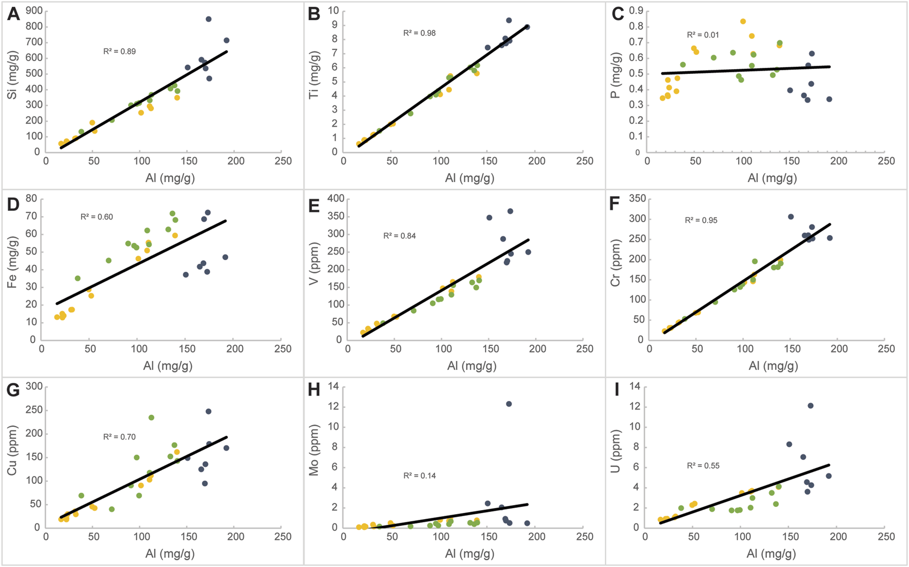 Linear cross-plots with R2 values generated by Microsoft Excel 2016 are also employed to determine correlations between Al and the other trace elements.