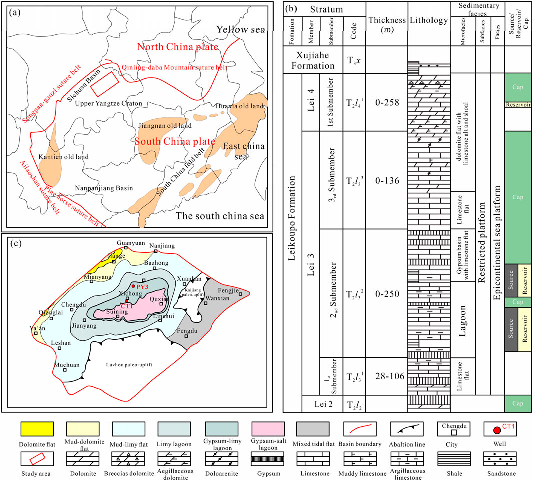 Figure 1. The tectonic background and paleogeography of Sichuan Basin (a) Paleogeography of South China Plate tectonics during the sedimentation period of Leikoupo Formation; (b) Chart of stratigraphy and sedimentary facies of the Leikoupo Formation in the Sichuan Basin (modified from Zhang et al., 2023); (c) Sedimentary facies map of the Leikoupo Formation in the Sichuan Basin (modified from Wang et al., 2023).