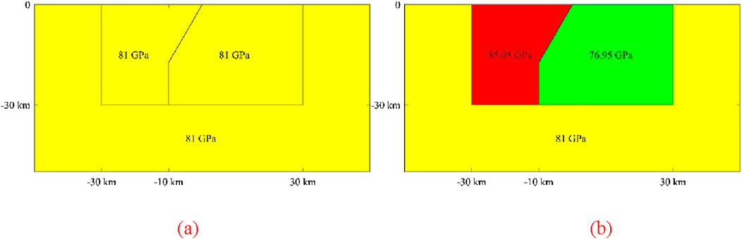 Figure 7. Benchmark tests of medium heterogeneity effects on coseismic slip inversion across fault zones (a) Homogeneous model (Model1); (b) Heterogeneous model (Model 2). The numerical values in GPa represent the Young’s modulus of respective regions. All domains maintain a uniform poisson’s ratio of 0.25.