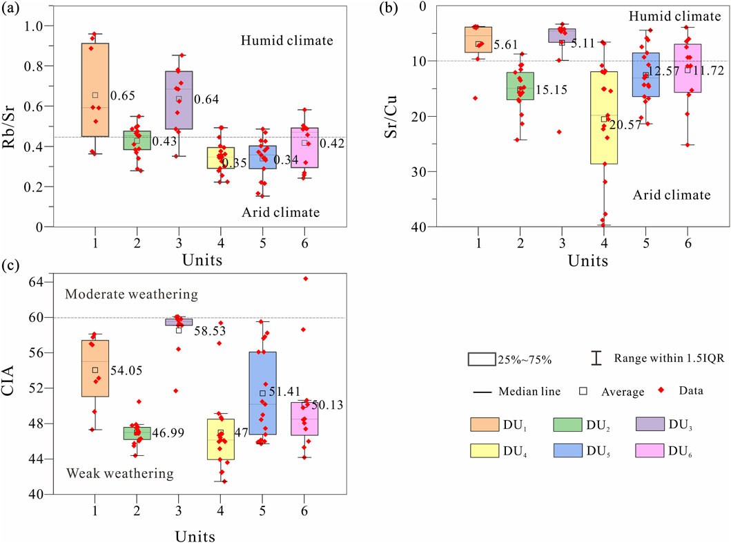 Figure 4. Box-plots of paleoclimate-related geochemical proxies in Core DZQ01: (a) Rb/Sr ratio, (b) Sr/Cu ratio, (c) Chemical Index of Alteration (CIA).