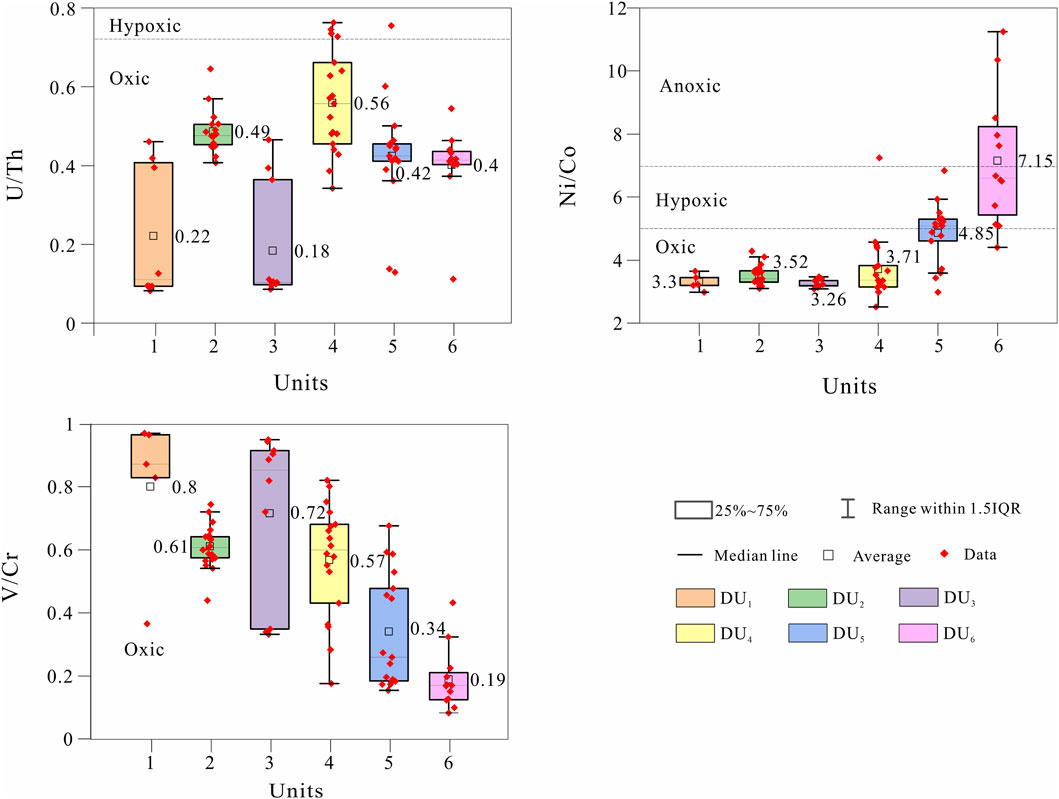 Figure 7. Box-plots of paleoredox-related geochemical proxies in Core DZQ01. (a) U/Th ratio, (b) Ni/Co ratio, and (c) V/Cr ratio. The cutoff of the U/Th and Ni/Co according to the references.