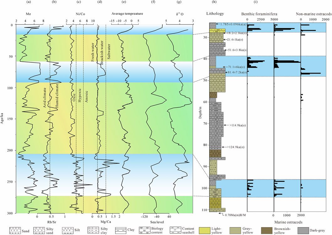 Figure 8. Composite Stratigraphic Profile of the Sedimentary Environment Characteristics from the core DZQ01. (a) Mean grain size; (b) Rb/Sr ratio; (c) Ni/Co ratio; (d) Mg/Ca ratio; (e) Average temperatures; (f) Global sea-level changes (Miller et al., 2005); (g) Deep-sea δ18O record (Lisiecki and Raymo, 2005); (h) Lithological characteristics and chronological framework; (i) Downcore variation distribution of benthic foraminifera, marine ostracods, and non-marine ostracods represent the total counts of each taxonomic group in Figure 2.