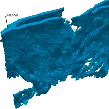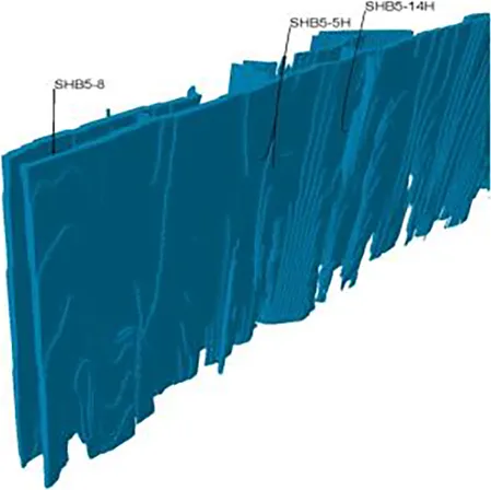 Different reservoirs in the fault-controlled body manifest differently on the seismic profile, corresponding to the different seismic attribute bodies. Using the deterministic modeling method, the seismic attribute body is truncated, and the external contour model of the fault-controlled body is established (Choquette and Pray, 1970; Kadlec et al., 2008; Lu et al., 2018; Li et al., 2019; Duan et al., 2023; Xie et al., 2023). The fault plane, cave-like, and disordered body reservoirs are described, and the obtained contour models of the different reservoirs are fused, yielding the contour model of the fault-controlled body. The detailed method is to normalize the structural tensor seismic attribute volume, the coherent energy gradient seismic attribute volume, and the variance seismic attribute volume to obtain the corresponding probability body model and then convert the attribute value into the probability value. The highest value in the initial attribute body is converted into a probability value of 1, indicating that the reservoir development probability in the highest attribute value area is 100%; while the lowest value in the initial attribute body is converted into a probability value of 0, indicating that the reservoir development probability in the lowest attribute value area is 0%. The most critical problem in the reservoir contour characterization is the determination of the critical probability value, that is, whether it is divided into the threshold value of the reservoir. The drilling enters the boundary area of the reservoir. Due to the changes in the physical properties, the phenomena of leakage and emptying occur. The leakage and emptying points of the drilling are calibrated, and the probability body threshold values at all of the drilling calibration points in the study area are counted to ensure that the fault-controlled reservoir covers all of the drilling wells. The minimum threshold value is selected as the critical probability value of the corresponding reservoir in the entire study area. The critical probability value information about the reservoir is obtained. That is, for the probability body obtained from the structure tensor, the probability critical value corresponding to the fault plane reservoir is 0.8, which indicates that the area with probability values of 0.8–1 is the fault plane reservoir. For the probability volume obtained from the coherent energy gradient, the critical probability value corresponding to the cave-like reservoir is 0.76, indicating that the area with probability values of 0.76–1 is a cave-like reservoir. For the probability volume obtained from the variance, the critical probability value corresponding to the disordered body reservoir is 0.67, indicating that the region with probability values of 0.67–1 is a disordered body reservoir. By using the corresponding critical probability value for truncation processing, the probability volume in the interval is retained, and a contour model of the fault plane, cave-like, and disordered body reservoirs can be obtained respectively (Equation 4). The three types of reservoirs are fused to obtain a fault-controlled body contour model for the study area (Figure 8).where is a three-dimensional grid model, is the probability volume obtained by normalizing the structure tensor seismic attribute volume and truncating it using critical value, is the initial contour of the fault plane reservoir, is the probability volume after the normalization processing of the coherent energy seismic attribute volume is truncated using the critical value, is the initial contour model of the cave-like reservoir, is the probability volume after the normalized variance seismic attribute volume is truncated using the critical value, is the initial contour model of the disordered body reservoir, and is the initial contour model of the fault-controlled body reservoir. Since all the parameters in the above equations represent a particular model, there are no corresponding international units.
