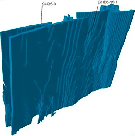 (1) First, by adopting the deterministic modeling method, the contour model of the reservoir (fault plane and cave-like reservoirs) is used as the constraint. The entire area within the scope of the contour body is defined as the bedrock belt, and a model of the bedrock belt is established.