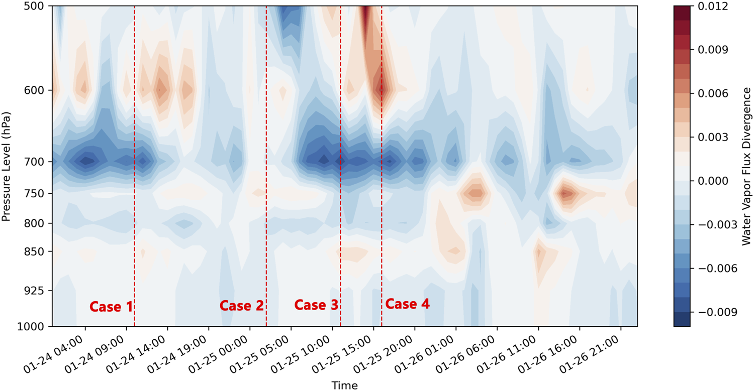 The warm air ascending over the cold air results in a much smaller vertical temperature gradient within the frontal zone compared to that within the air masses on either side, sometimes even leading to a temperature inversion (where temperature increases with altitude). As indicated by the green contours in Figure 4, the temperature inversion layer can be primarily observed to the east of the YGQSF. This study selects a representative point within the cold air mass to construct a time-height cross-section of moisture flux divergence, as shown in Figure 5. The inversion layer on the cold side of YGQSF exhibits persistent stability, facilitating sustained moisture convergence within the inversion layer (850–600 hPa, maximized at 700 hPa) and promoting the development and maintenance of frontal cloud systems (Figure 5). Particularly, in Cases 1, 3, and 4, the moisture flux divergence value can reach more than −0.006 g cm-2·h-1, providing sufficient moisture conditions for the formation of supercooled water droplets within clouds.
