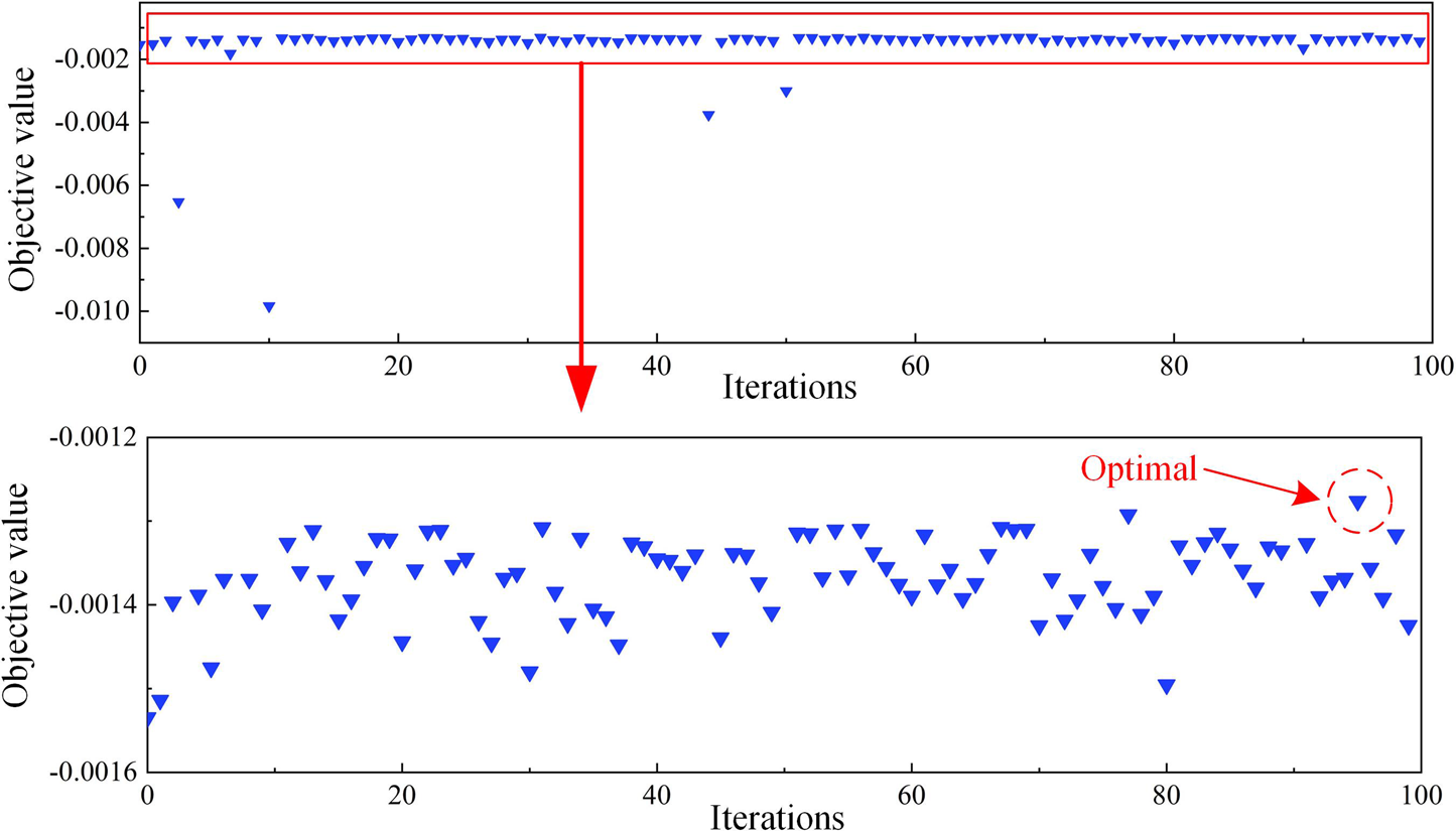GP regression is employed to estimate the posterior distribution of the target function, and the next set of hyperparameters to sample, , is selected using Bayes’ theorem, representing possible parameter values. The goal is to identify the set of hyperparameters that optimizes the target function, either by minimizing or maximizing it. This process is iteratively refined by utilizing previous sampling results to improve the target function, ultimately aiming to find the global optimal hyperparameters. The acquisition function is expressed as Equation 17.where denotes the objective function of the hyperparameters, x* represents the optimal hyperparameter set.